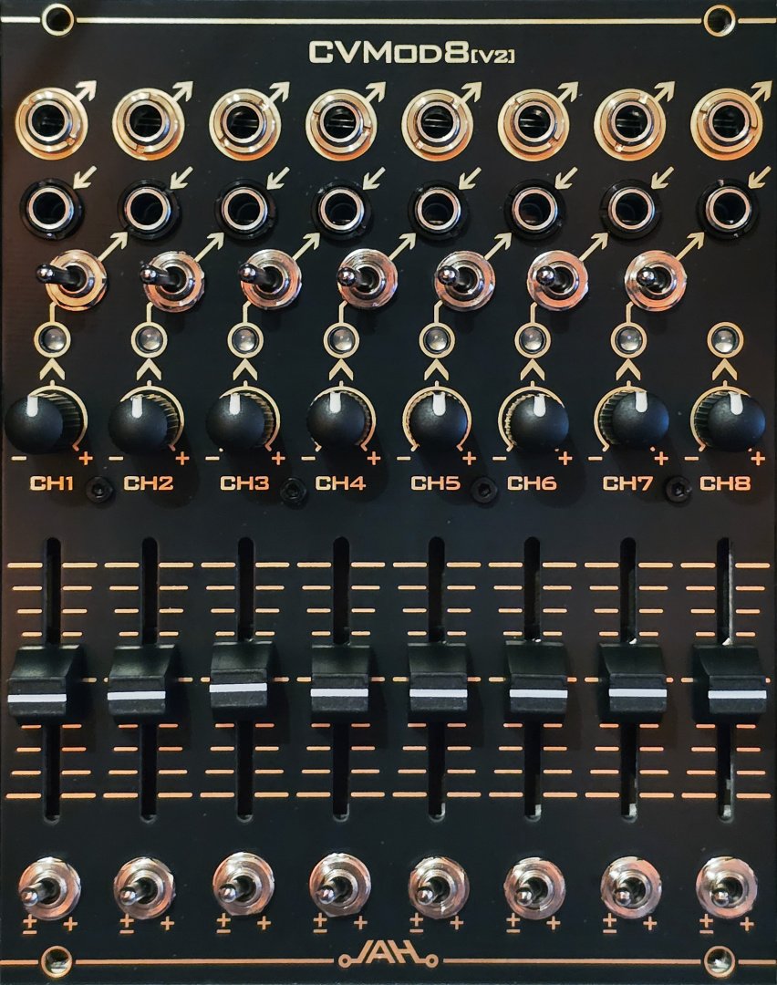 CVMod8 V2 is successor to the old CVMod8. The module provides 8 channels of independent CV attenuverters and offset controls, as well as offset polarity switches and forward switches for mixing the channels together.