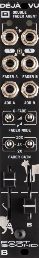 Déjà vu has two almost identical channels A and B. Each channel has the FADER input and the ADD input and an output with light indication. The FADER MODE switch alters the behavior of the module, either attentuating or attenuverting the FADER input where the ADD input will be added to the processed FADER input. The last option is crossfading between the FADER Input and the ADD input which is great for creating performance oriented macro controls.