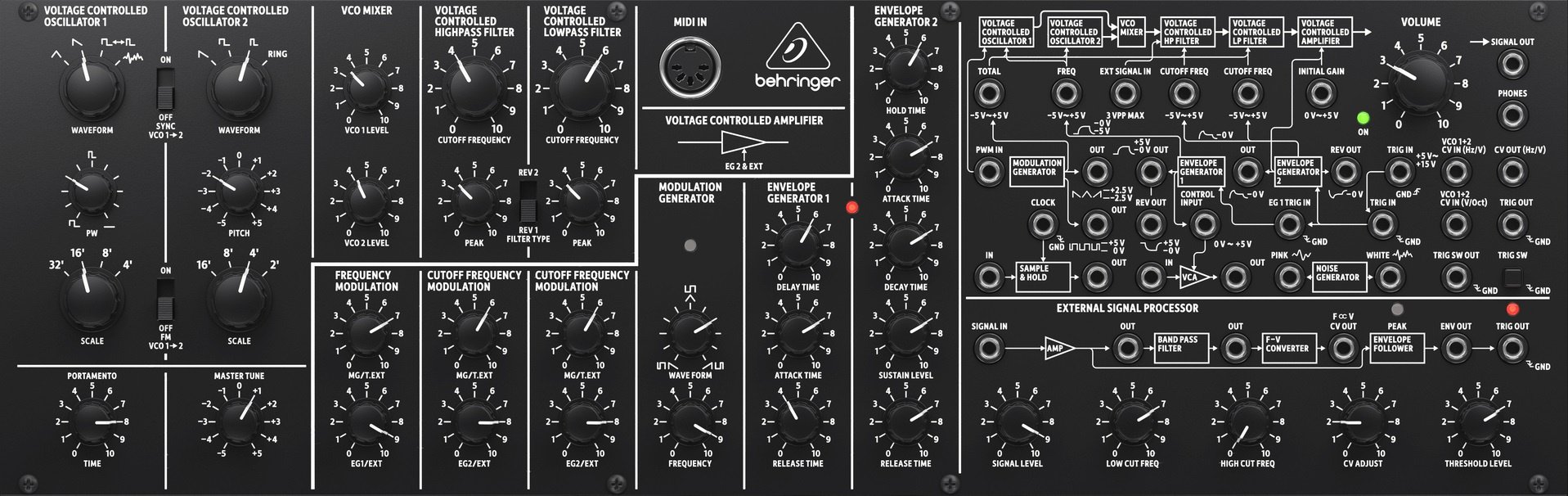 Great care has been taken in engineering the K-2 MK II, including the true to the original VCO, VCF and VCA designs and pure analog circuitry with matched transistors and JFETs. This highly-focused attention to detail is what gives K-2 MK II its ultra-flexible sound shaping capability, which covers everything from super-fat bass and lead tones to stunning effects – all the way out to the otherworldly sounds of your imagination.