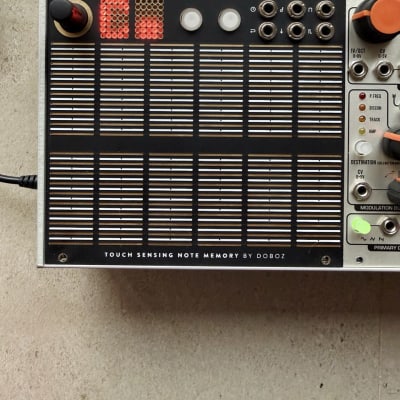 Touch Sensing Note Memory MKII is the second incarnation of TSNM in Eurorack format. Transposition plates have been replaced by illuminated pushbuttons, thereby freeing up some space for two more note plates. The module does not require external 5V power source anymore, and the footprint for the MPR121 breakout board now accepts the ones made by Adafruit also. The panel got narrower by 2hp, now comes with matte black finish and gold plated holes over the LED display for better visibility. Firmware v4.0 introduces some new features: