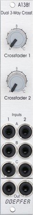 Module A-138f contains two identical crossfaders with three inputs and one output each. Three different signals are connected to the inputs A, B and C. In the ccw position of the corresponding control only signal A appears at the output. Between ccw and center position a mix of the signals A and B appears at the output. In the center position only signal B appears at the output. Between center and cw position a mix of signals B and C appears at the output. In the cw position only signal C appears at the output.