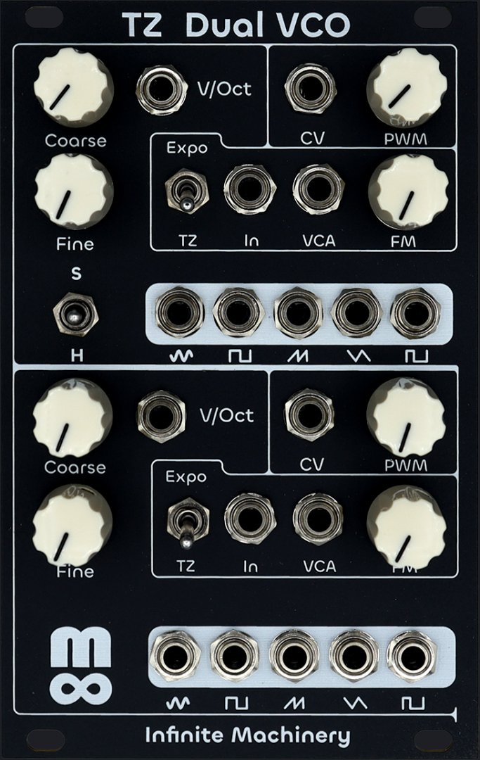 The TZ Dual VCO is two full featured VCOs on in a single 16HP module. Both VCOs output sine, square, saw, triangle and PWM wave forms. Each VCO also has thru-zero and exponential FM input. The type of FM is selectable using a toggle switch. An important feature of TZ Dual VCO is the FM input for each VCO can be control by a VCA input. A potentiometer adjusts the overall maximum of the FM input while the VCA provides an amplitude envelope.