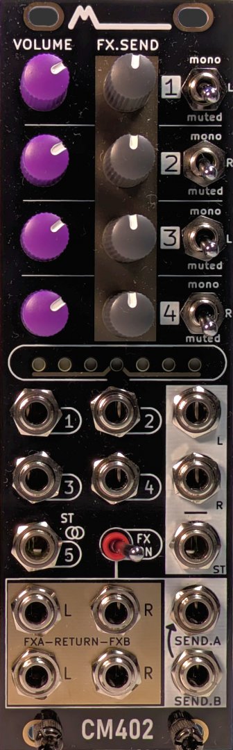 The CM402 compact mixer is eurorack module with 4xMono + 4xStereo channels, with dual auxiliary send/returns, an RGB LED peak meter, mute switching, configurable panning (rear panel trimmers), switchable effects returns, in a space saving 8HP package. Channels 1-4 have a volume pot, an aux level pot and a combined mute/panned/center toggle switch. Channel 5 is fixed at simple TRS stereo input at unity gain. You can chain multiple units together with ribbon cables. Panning may be adjusted using the trimmer pots on the back of the module.