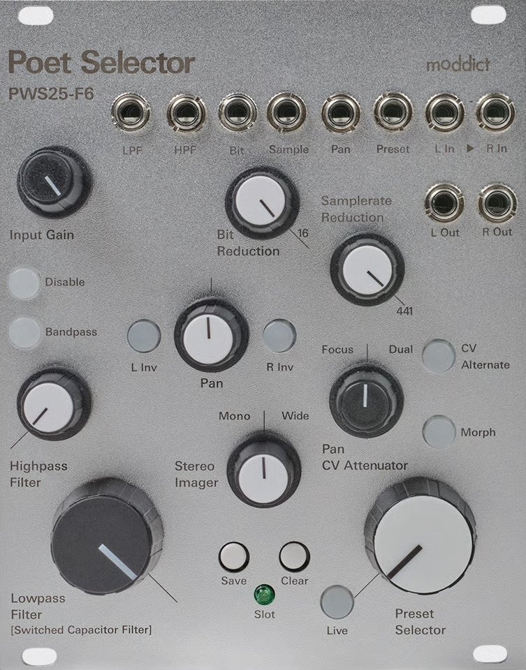 Poet Selector [PWS25-F6] is a digital-analog hybrid module combining a stereo utility, bit crusher, digital high-pass/band-pass section, and an analog switched-capacitor filter from the Akai S612.