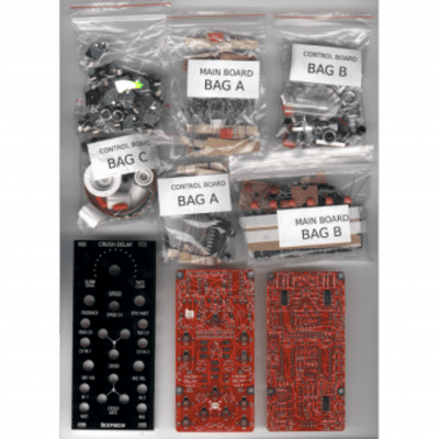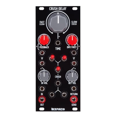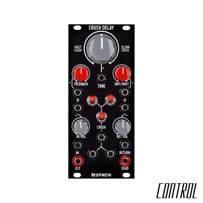 Crush Delay v3 is a special Echo-Delay unit based on the PT2399 IC, which is able to offer 400ms of clean delay and up to 2 seconds of dirty repetitions, having a special talent to generate noisy-glitch textures. The module bases its operation on controlling the PT2399 chip with circuit bending techniques, converting the unit in an advanced VC digital trash generator. This third version comes with some interesting new features like redesigned VCAs circuits, wider range for clean delay and reduced depth to make it skiff friendly.