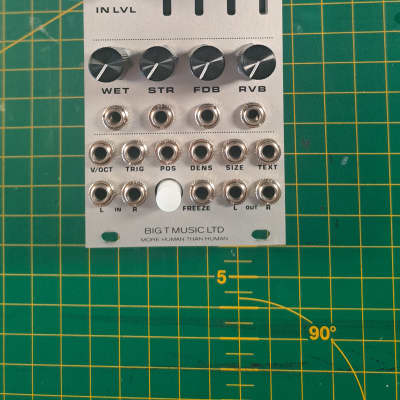Dry/Wet, Stereo, Feedback and Reverb now have independent controls and are each CV addressable. 12hp (6hp smaller than the original). Anodised aluminium knobs and a choice of high quality precision milled aluminium or black and gold FR4 panel. Bipolar LEDs for visual feedback of input CV. Centre detent sliders and tune knob. White LED Freeze button.