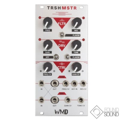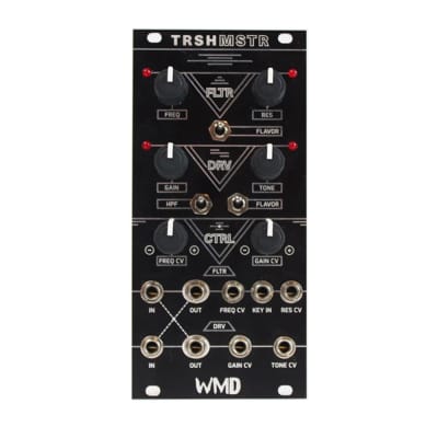 TRSHMSTR is a collaborative effort between WMD and electro-dance heavyweights MSTRKRFT. TRSHMSTR features an aggressive combination of band-pass filtering (FLTR) and distortion (DRV). The FLTR and DRV sections can be used independently or together to produce a wide variety of tone-shaping, from subtle distress to full-on acid destruction. The INs and OUTs of the FLTR and DRV sections are cross-normalled, so you can run your signal through FLTR and into DRV or vice-versa with no extra patching.