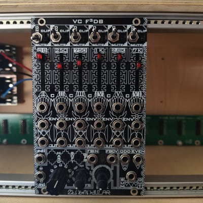 VC F3DB stands for Voltage Controlled Fixed Filter Feedback Distortion Bank. The simplest description is it's an analog 6 band voltage controlled fixed filter bank. But with the additions of so much gain, clipping, feedback, and self-oscillation it becomes a very flexible and unique gestural sound sculpting tool capable of; graphic equalization over 6 octaves, multi-band distortion, spectral processing, crude vocoding, multi-frequency envelope following, self modulation, and even as an instrument on its own. With no input it can be used as a pseudo chaotic "harmonic" feedback oscillator.