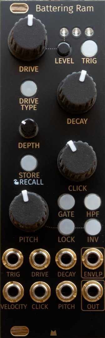 Black & Gold replacement panel for Shakmat Battering Ram eurorack module.