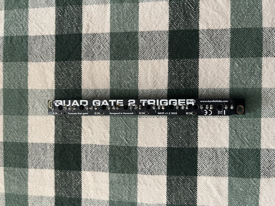 Get not one, not two, not three, but four gate to trigger converters to keep your gates in check and generate trigger patterns from mostly any gatelike, squarewavey, or just impressively loud signal. But wait, there's more - the inputs are normalled to each other, so plug in one signal, and all the following trigger outputs will generate a trigger. Four triggers in one! That's incredible value!