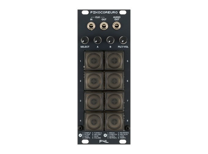 Using the PIKOCOREURO is simple and intuitive, with eight ultra-playable buttons for creating sequences and applying effects. Knob controls for selecting samples, adjusting parameters, and a combined volume and filter control round out the physical interface, providing just enough hands-on control to dial in effects and sequences to your needs. Integrate PIKOCOREURO with the rest of your system using the clock input and output, ensuring your glitches and beats arrive right in time with your other voices. Using the USB-C input on the back of the module, you can upload your own samples, enabling endless fun with all types of audio. The original Pikocore is a fantastic tool for generating instant breakbeats and sample manipulations, and the PIKOCOREURO from P4L brings this powerful processor to Eurorack systems in an even more playable design for maximum modular fun.