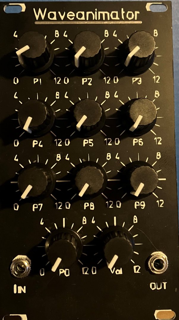 Multi phase waveform animator as described in EN#87 pg.3 ff by Bernie Hutchins. This module takes a single sawtooth waveform and then uses nine phase shifters to provide shifts from 0° to 360°. These shifts are controlled each by an independent oscillator which operates on a frequency of about 0.01Hz to 1.0Hz. The nine shifted waveforms are then mixed back together, along with original, to a composite sound. The volume of all phase shifted waveforms and the original are controlled with potentiometers. So you can dial in any amount of animation you like. You can choose from a variety of frequencies for the phase shifters. The method used here is described in EN#40 by Ralph Burhans. Ralph found that if you space frequencies at the fifth root of 2.1, you get no harmonic overlap over a 10 octave range. This is important because we don't want to produce patterns which will repeat and be detected by our ears to keep the sound animated. As you can see in the screenshots you can use this module for other waveforms as well.