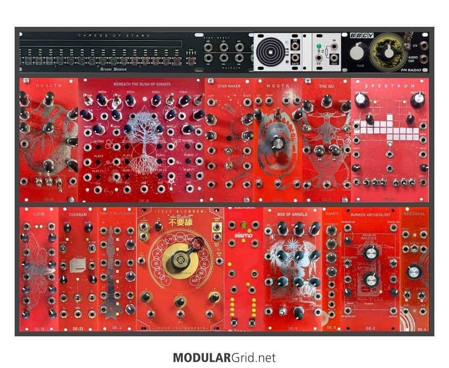 Achtung This Rack contains modules with incomplete power consumption specs: Arcane Devices Caress of Stars, DE-8 – BENEATH THE BUSH OF GHOSTS, DE-22 Tangram, DE-13 Star Maker, DE-5 – SHAKTI, DE-24 Spektrum, DE-12 Lucid