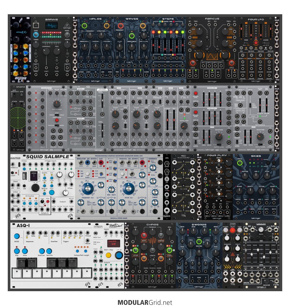 Power Consumption: 2687 mA +12V | 1213 mA -12V | 0 mA 5V | Depth: 52 mm | Price: $4,895 | Number of Modules: 33 | Data Sheet Achtung This Rack contains modules with incomplete power consumption specs: none