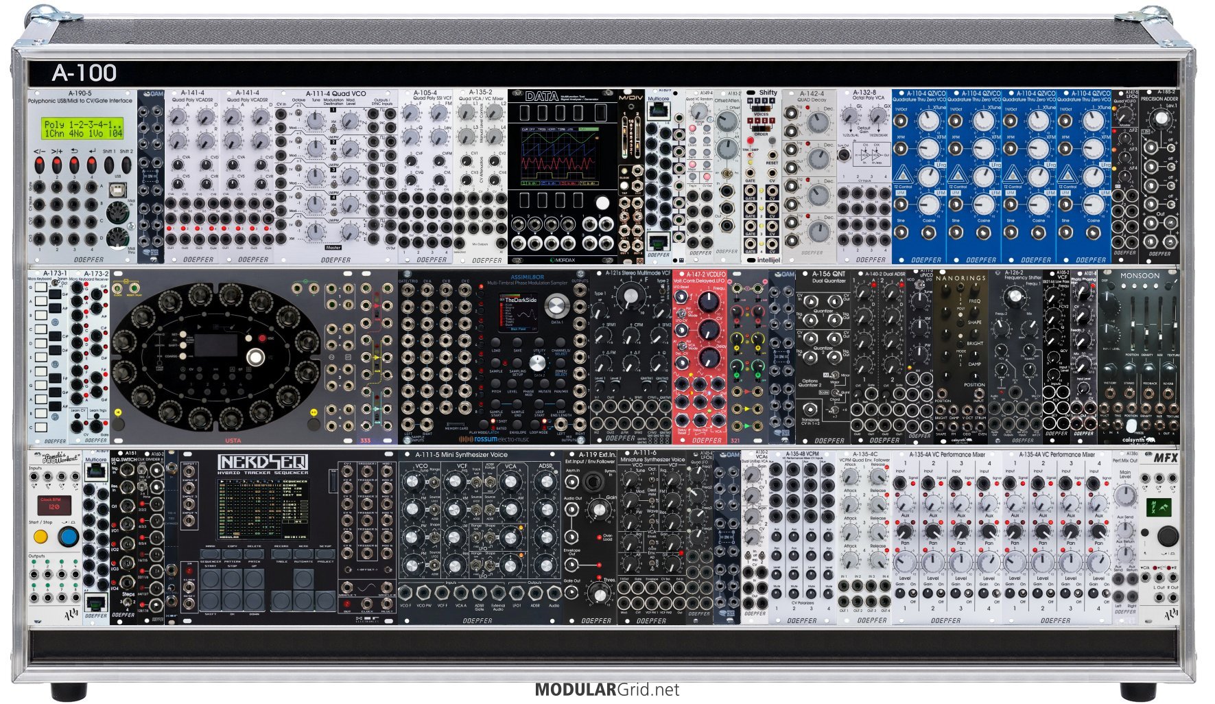 Power Consumption: 3697 mA +12V | 1829 mA -12V | 0 mA 5V | Depth: 65 mm | Price: $12,685 | Number of Modules: 57 | Data Sheet Achtung This Rack contains modules with incomplete power consumption specs: none