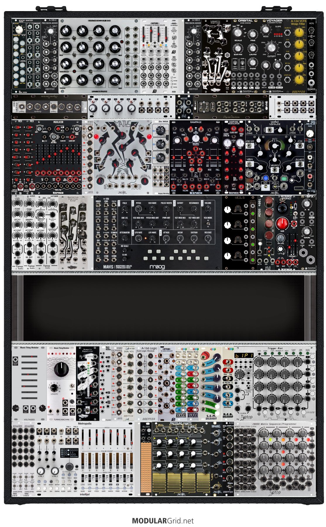 104hp, top: MDLR 10u, mid: Make Noise 3u, bottom: Dark Modular 6u phonofidelic