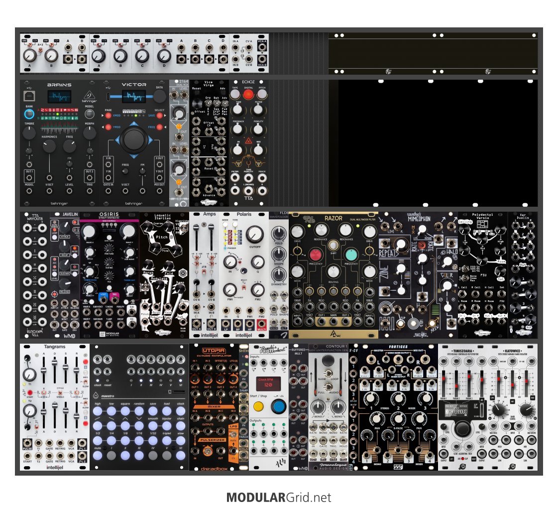 Power Consumption: 1990 mA +12V | 1097 mA -12V | 90 mA 5V | Depth: 43 mm | Price: $6,758 | Number of Modules: 38 | Data Sheet Achtung This Rack contains modules with incomplete power consumption specs: none