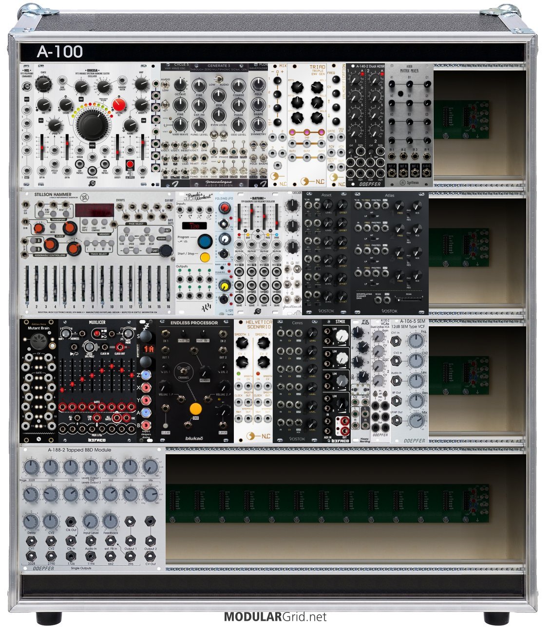 Power Consumption: 1644 mA +12V | 972 mA -12V | 0 mA 5V | Depth: 70 mm | Price: $6,229 | Number of Modules: 29 | Data Sheet Achtung This Rack contains modules with incomplete power consumption specs: none