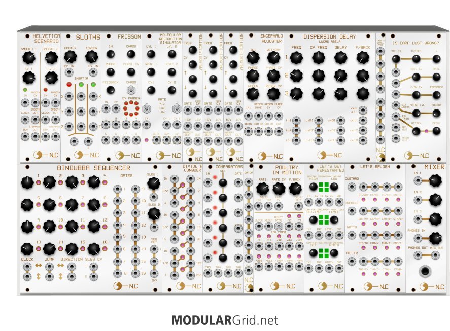 Achtung This Rack contains modules with incomplete power consumption specs: Molecular Relaxation Simulator, Let's Get Fenestrated (white panel), Frisson, Triple Sloth white panel, Poultry in Motion, Comparators