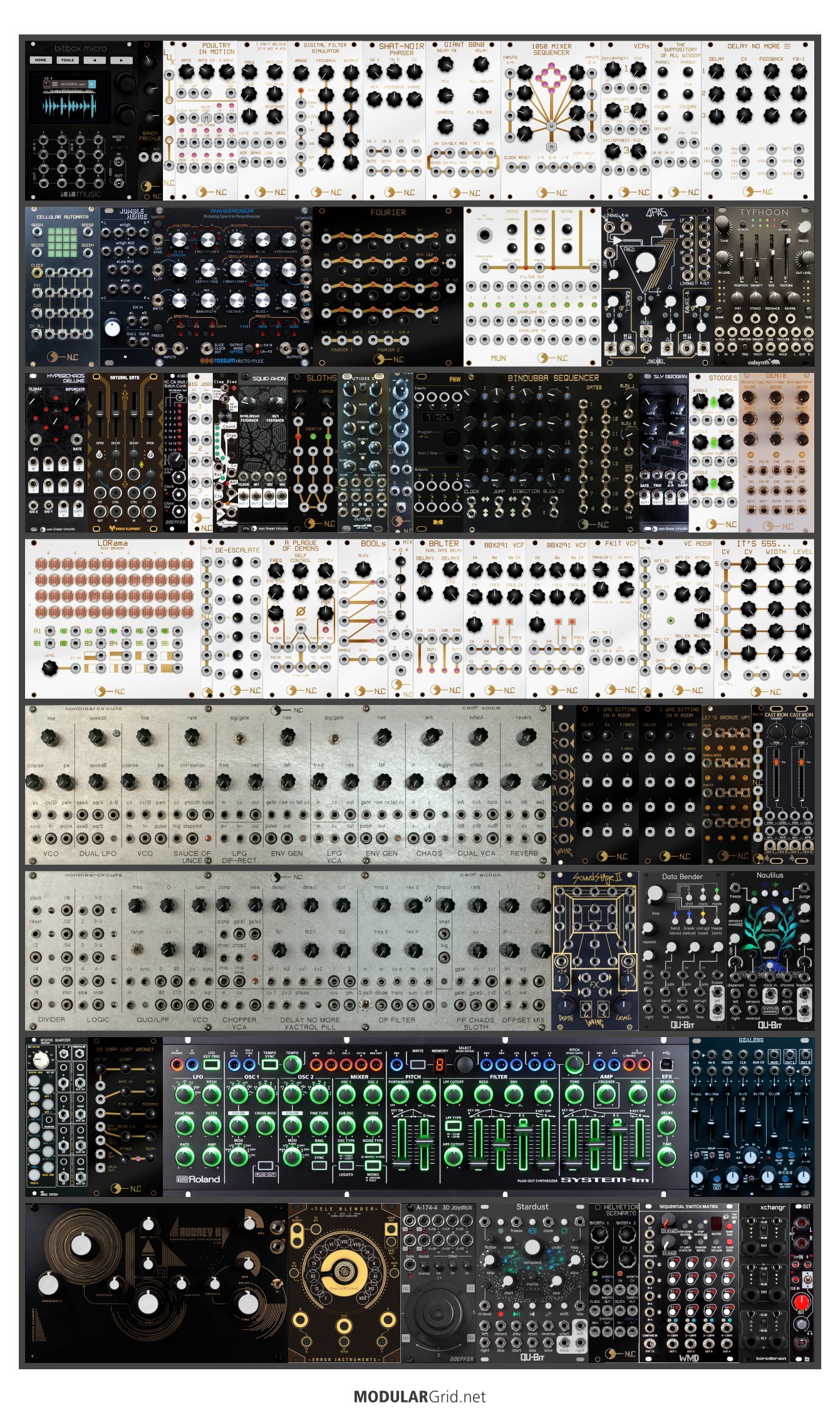 Achtung This Rack contains modules with incomplete power consumption specs: VC ADSR, The Suppository of All Wisdom, Stooges, GENiE, MUN, Poultry in Motion, Lux, Is Carp Lust Wrong? (Black panel), Shat-noir Phaser, Sandy Freckle (black panel), Big Jobs, cellF voice