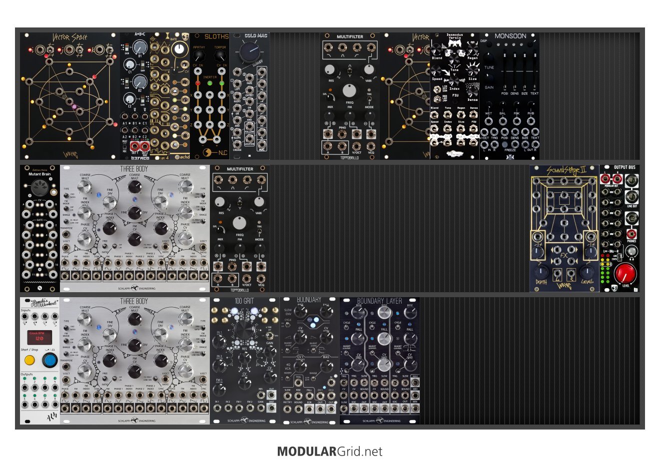 Power Consumption: 841 mA +12V | 523 mA -12V | 0 mA 5V | Depth: 38 mm | Price: $3,097 | Number of Modules: 9 | Data Sheet Achtung This Rack contains modules with incomplete power consumption specs: none