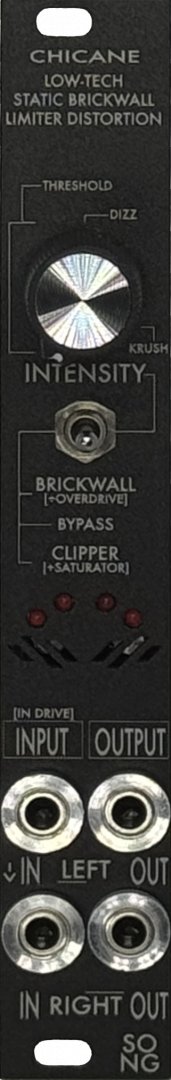 CHICANE is a stereo static brickwall diode limiter. It can be used as a dynamic control effect or as a straight heavy distortion module. In any case, it will color everything you feed it.