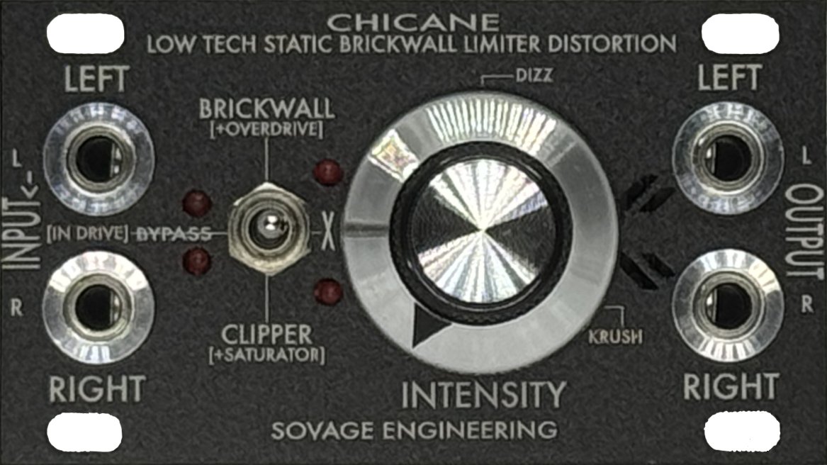 CHICANE is a stereo static brickwall diode limiter. It can be used as a dynamic control effect or as a straight heavy distortion module. In any case, it will color everything you feed it.