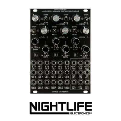 Under the hood, OXYMORON is packed with six independent modulators connected in cascade, each featuring both sinusoidal and square waveform outputs. These can range from fast to slow with a flick of a switch or can be used as oscillators in the middle switch position. It also features three channels, labeled A, B, and C, each with a mix output of two modulators and a volt-per-octave input per channel. This results in incredible detuned tones, powerful synced bass, leads and chords, or chaotic modulation when used as an LFO.