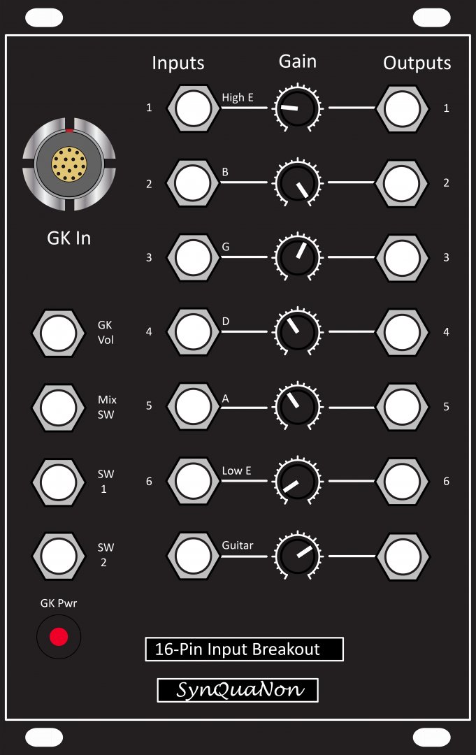 The 16-Pin Input Breakout module receives signals from a Roland-ready or GK guitar and converts them to modular levels using low-noise audio op-amps.