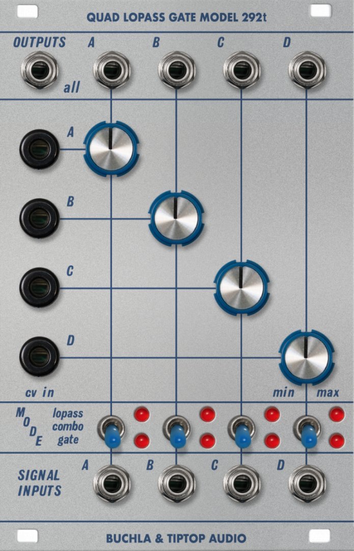 The RoHS-compliant (non vactrol) version of the Tiptop Audio Buchla Model 292t Quad Lopass Gate