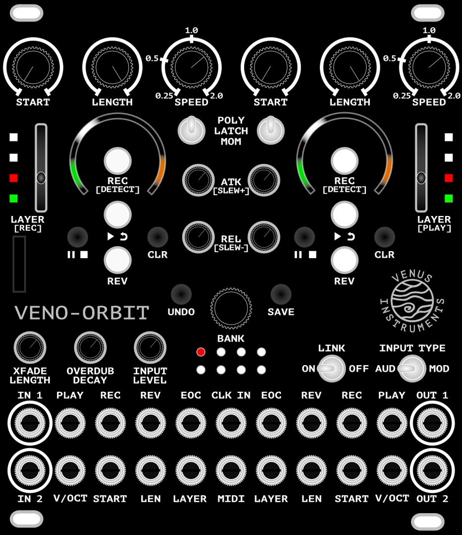 The Veno-Orbit is a dual channel, polyphonic, experimental sampler designed for live recording and manipulation of audio and CV. With an immediate user interface with no menus, 1 knob per function, and intuitive LED feedback, the module is both quick and flexible, allowing for maximum creativity.