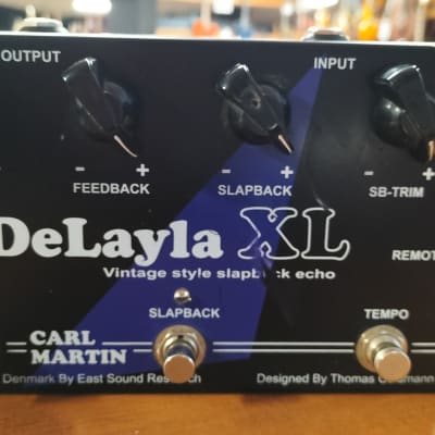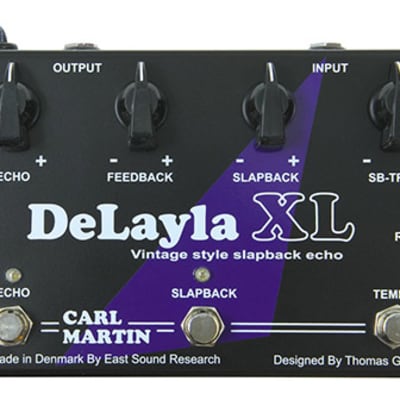 This pedal includes both a tap-tempo-controlled echo, as well as a slapback "second tape head". The pedal uses an integrated power supply and non-removal power cable, attached to the unit.