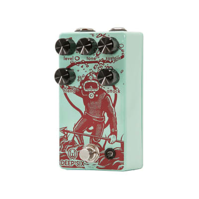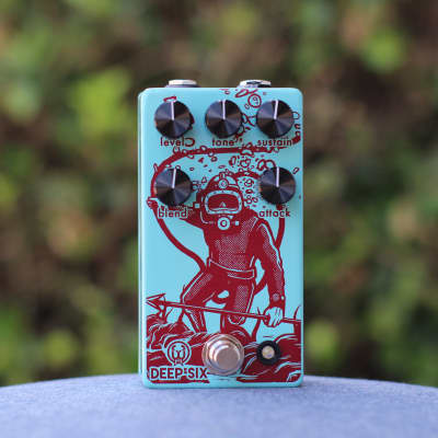 The Deep Six is a true bypass studio-grade compressor in stomp box form, inspired by the performance of the Universal Audio 1176 with the simplicity of the Ross and Dynacomp. Offering a Level, Sustain, Attack, and Blend control, the Deep Six will give you unmatched versatility at a price you can afford. Polarity will never be an issue as the Deep Six comes standard with a polarity correction circuit. The internal voltage is doubled to 18 volts giving you the maximum amount of headroom for your sound while maintaining a typical current draw of 8.9mA. The Deep Six also offers a Blend and Attack control which allows you to use the pedal with active pickups or humbuckers. The blend feature allows you to use high output instruments while truly being able to dial out any distortion that may be present.