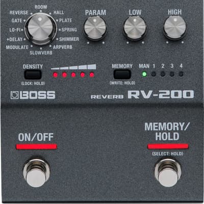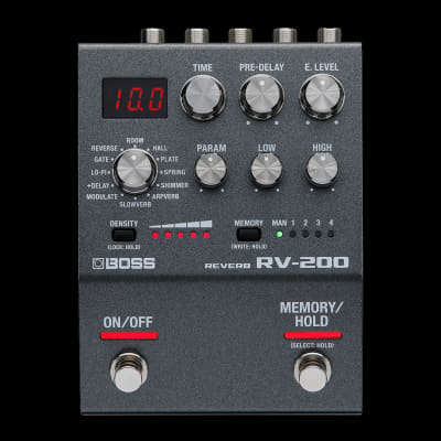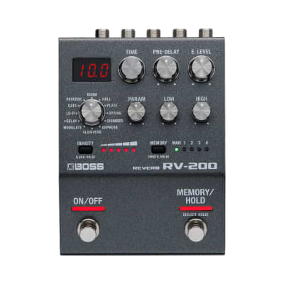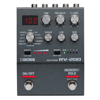 The RV-200 reverb pedal from BOSS empowers you with 12 classic and contemporary reverb styles, true stereo, a user-friendly interface, and deep customization, including footswitch-activated reverb modifiers! With the capability to store up to 127 user presets, the RV-200 is likely the only reverb pedal you'll ever need — gone are the days of dialing in a sweet plate or drippy spring sound only for it to vanish when you reach for something more ambient or experimental. The RV-200 features a high-visibility LED for smooth editing and easy navigation, even onstage in the dark. Furthermore, this DSP powerhouse boasts a 96kHz sampling rate, 32-bit conversion, and 32-bit floating-point processing for astoundingly lushness and fidelity, especially in stereo. You can integrate the RV-200 into any rig, then customize your workflows with built-in MIDI or supplement controls using footswitches, expression pedals, or other 200 series pedals. Discover a comprehensive reverb tool that tone tweakers, professional performers, and ambient artists can get behind with an RV-200 reverb pedal from Sweetwater.