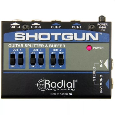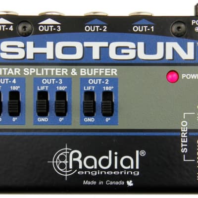 The Shotgun makes it easy to drive multiple amplifiers cleanly and in phase without buzz or hum from ground loops. In mono operation, connect to input-1 of the Shotgun and you can feed up to four amps simultaneously. For stereo setups, the Shotgun automatically reconfigures when both inputs are used; feeding input-1 to the first two amplifiers, and input-2 to the second pair. Isolation transformers and ground lifts are included on the outputs to eliminate ground loop noise, along with 180° polarity reverse switches to ensure all amps are phase-matched.