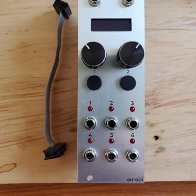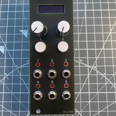 The EuroPi (new hardware) has 6 CV outputs (0-10V), one analogue input (0-10V), one digital input (clock or gate), two knobs, two push buttons, and a 128x32px OLED display.
